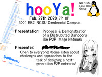 Hello; PSA I'm giving a talk on 2/27 from 7P~8P on Centennial campus EB2 Rm. #3001 with the NCSU LUG and I'd love it if we could get a good and excited group out that night; I'm proposing / demonstrating a completely new concept for a purely P2P (i.e. peer-to-peer) overlay network on top of the Internet which functions like other existing P2P networks (Napster, GNUtella, Bitcoin) but is optimized and designed exclusively to provide for the distributed hosting and discovery of お絵描き (i.e. simply, "drawings") with a rigourous body of semantic/meaningful metadata attached to each file meant to rival that of hosted sites like Danbooru.