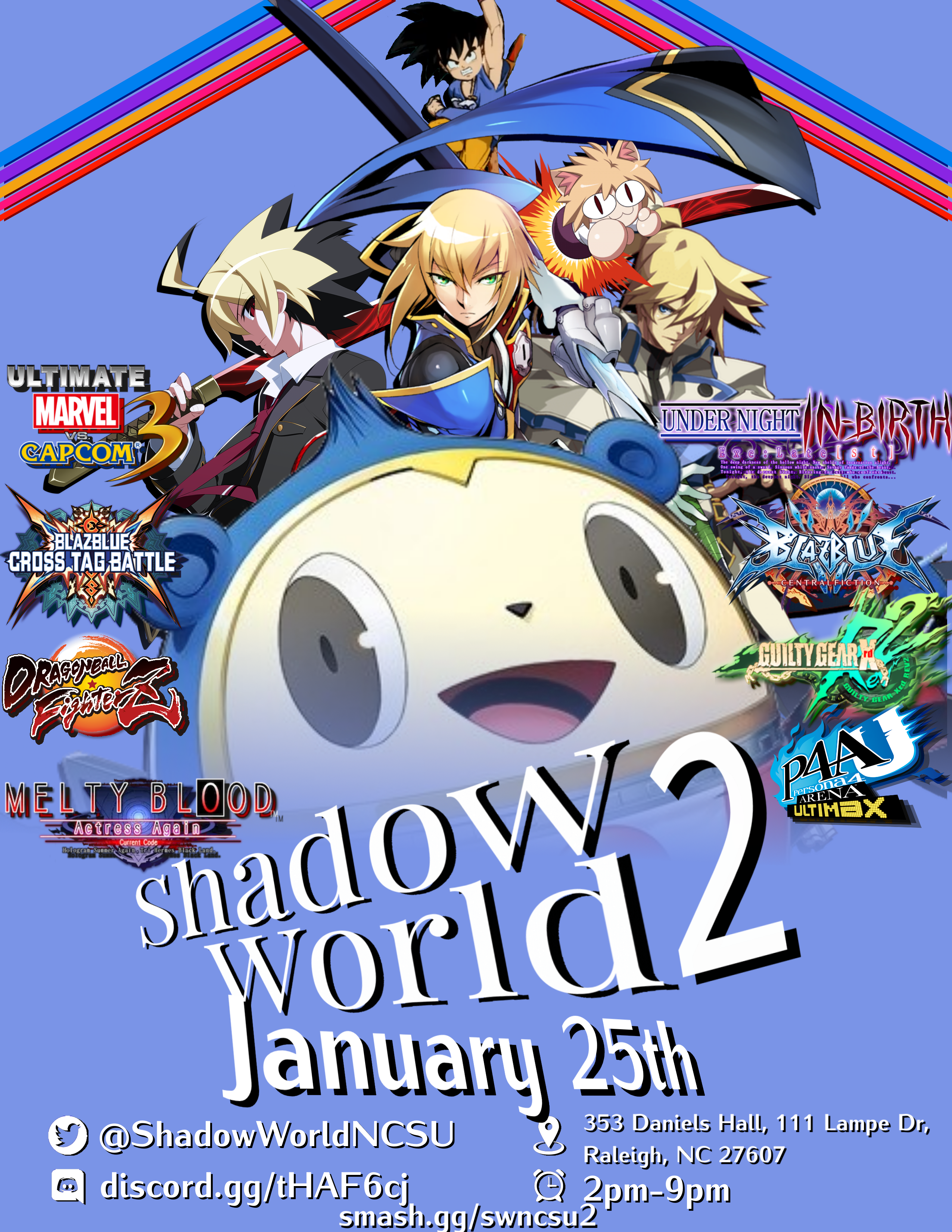 NC State's anime fighting game tourney, Shadow World, is returning with Shadow World 2 on Saturday, January 25th!All 7 games from last time will return, now with Dragon Ball FighterZ!For more details, check out the smashgg and Discord:http://smash.gg/swncsu2http://discord.gg/tHAF6cj
