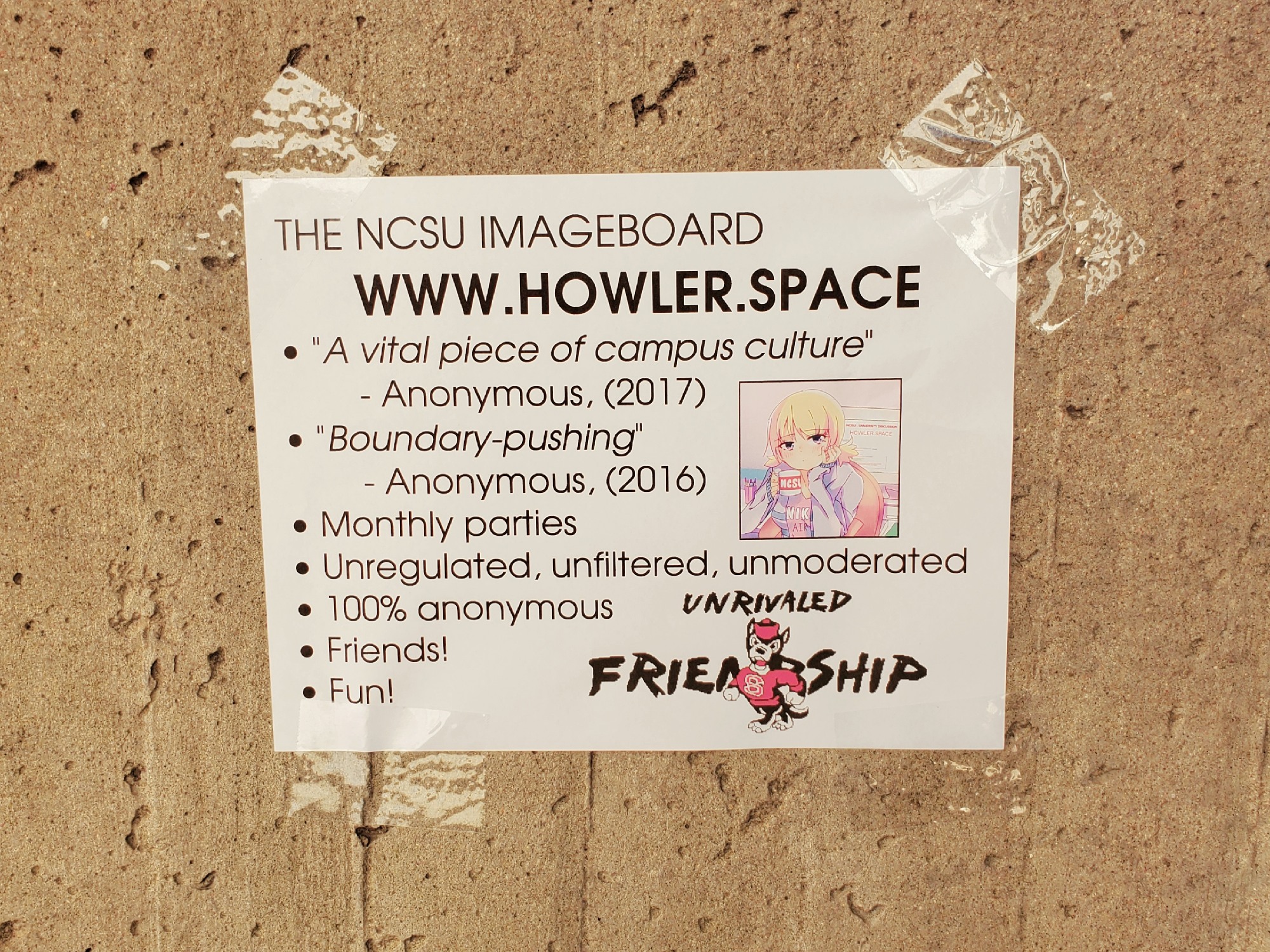 I don't really have anything to say, but I'll end on this. I finished undergrad in 2016 and by now, I've lost contact with almost every single person I met. It's sad, but normally the longer you live, the fewer people you have close connections with. It will happen again in a few months when I leave graduate school. But even if Howler dies, we should maintain some kind of group chat/IRC to stay in contact. Even if it quickly falls apart or turns into a self-referential circklejerk, it would be nice to try.