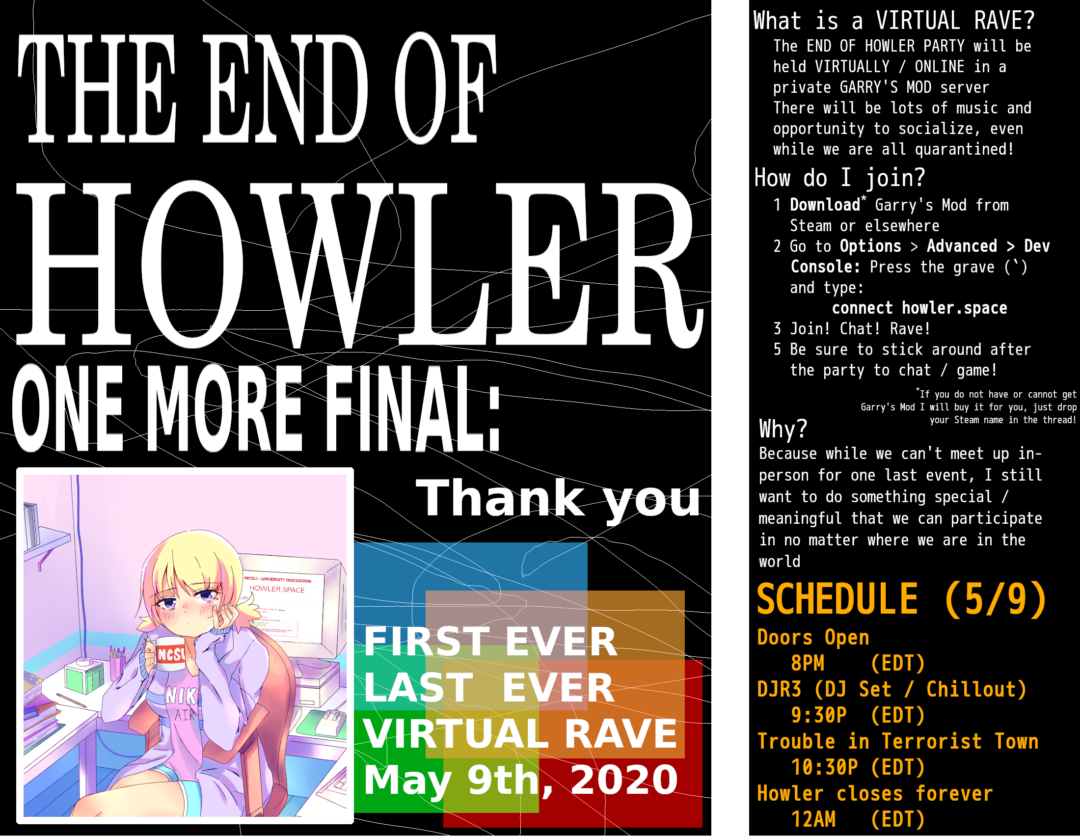 Hello from Raleigh, NC. As we approach the end of our time as a community, I've started thinking about having one last community-event. In just the last year we've hosted *so* many get-togethers and things; I don't know if we will ever realize the impact that our small community has had on the NCSU community (past, present, future) and more generally for communities of scale like this across US campuses at large; I want to celebrate the time we've spent together by throwing one last party the night that we shut down for good (May 9th). This has been an idea for quite some time; however (and unpredictably) we're not at liberty to host an in-person party, as many of us are quarantined and scattered across the country as the university gradually limits on-campus operations and generally transitions to a completely online delivery for the remainder of the term (sending nearly all on-campus students home and canceling all gatherings of more than 10). Keeping this in mind, we have decided to host the final event ENTIRELY ONLINE; we hope to see you there! We are in the process of setting up a GARRY'S MOD server to facilitate the VIRTUAL party; if you do not have Garry's Mod or cannot buy it, I will buy it for you, just drop your Steam name in the thread below. Date: May 9th, 2020 8PM (Eastern Daylight Time) Place: Garry's Mod Dedicated Server (URL: howler.space) Kick back and take it easy, /ncsu/