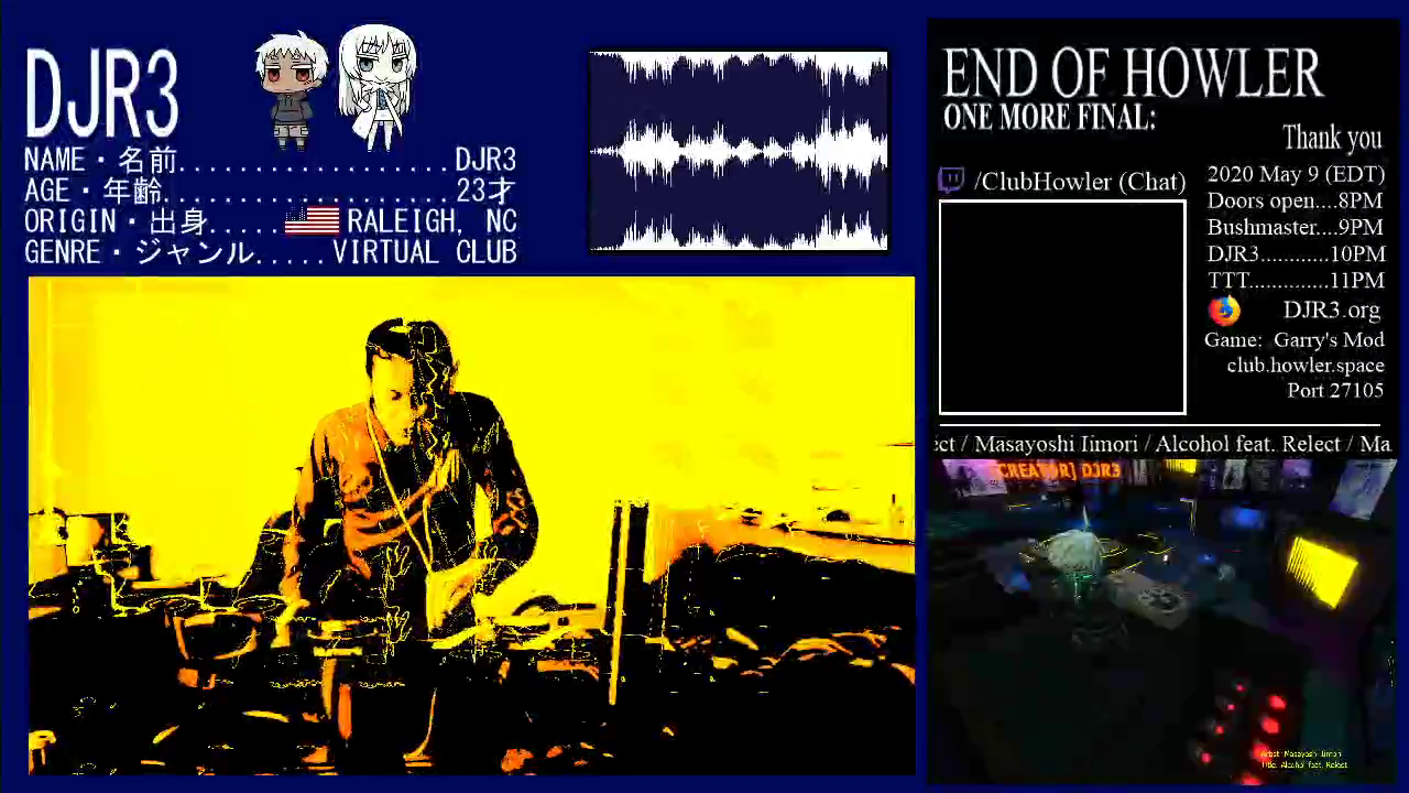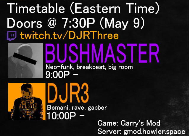 the party will be streamed on twitch.tv as well; invite whoever you want, the server can handle a lot of people (since we upgraded our hosting)stream URL: https://twitch.tv/DJRThree