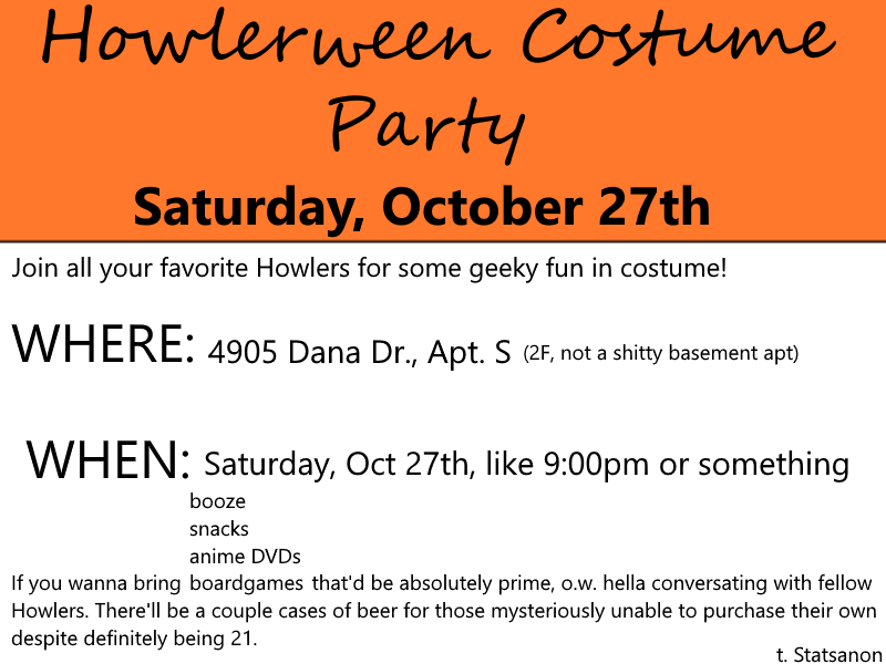 It's that time of year again! When all us absolute geeks dress up like our favorite (or most resembled) characters from our common cultural background of dragon ball z, video games, and internet culture! In accordance with the season and the complete lack of appreciation most non-Howlers have for DBZ , internet, and vidya costumes (read:cosplay)I propose we have our own costume party !Let's make merry and get not!wasted together and enjoy our beautiful "community"! I may be able to talk my flatmates into not hating a party at my place, or if there's anyone else who wants to host, that's cool, too!