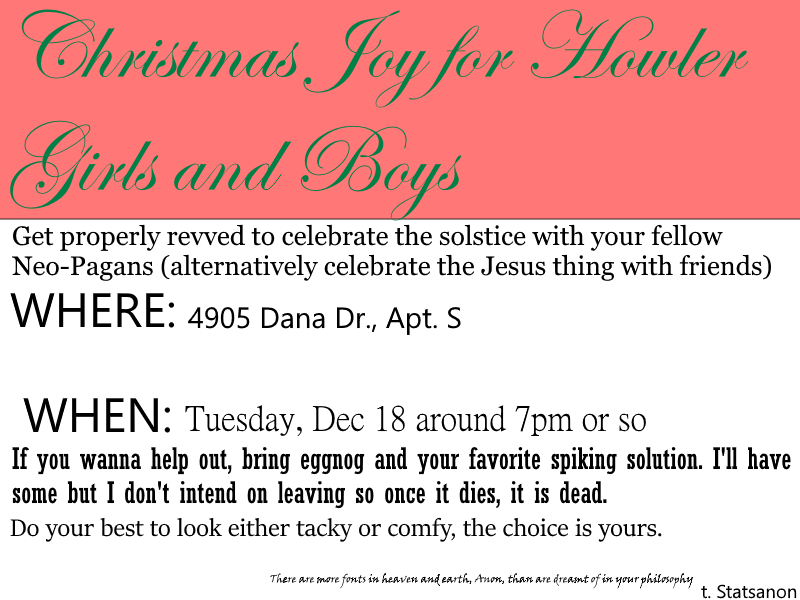 Also I mentioned before the possibility of a ~f r e e~ secret santa. Basially the rules would be no spending money to acquire the gift, so theft, creativity, and giving of things you already own are all super kosher, however you wanna do it. If you're interested, hmu at the email provided and give a lil blurb about yourself so your santa can give you the best gift possible. If less than 4 people are into it then probably a no-go, but with at least 4 we'll call it greenlit.