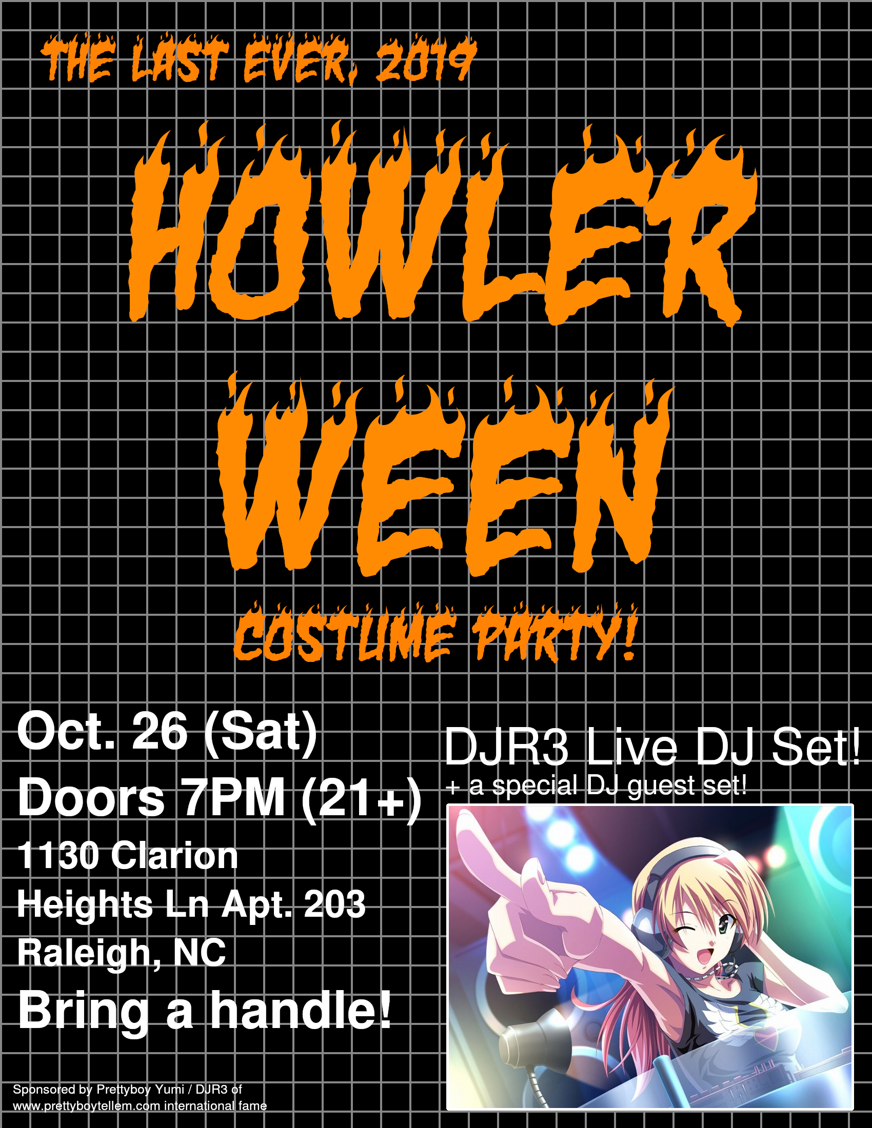 Hello, it's time for our annual Halloween costume party, the last ever HOWLERWEENLocation: 1130 CLARION HEIGHTS LN APT. 203 RALEIGH NCDate: 10/26 (Sat)Doors at 7PM
