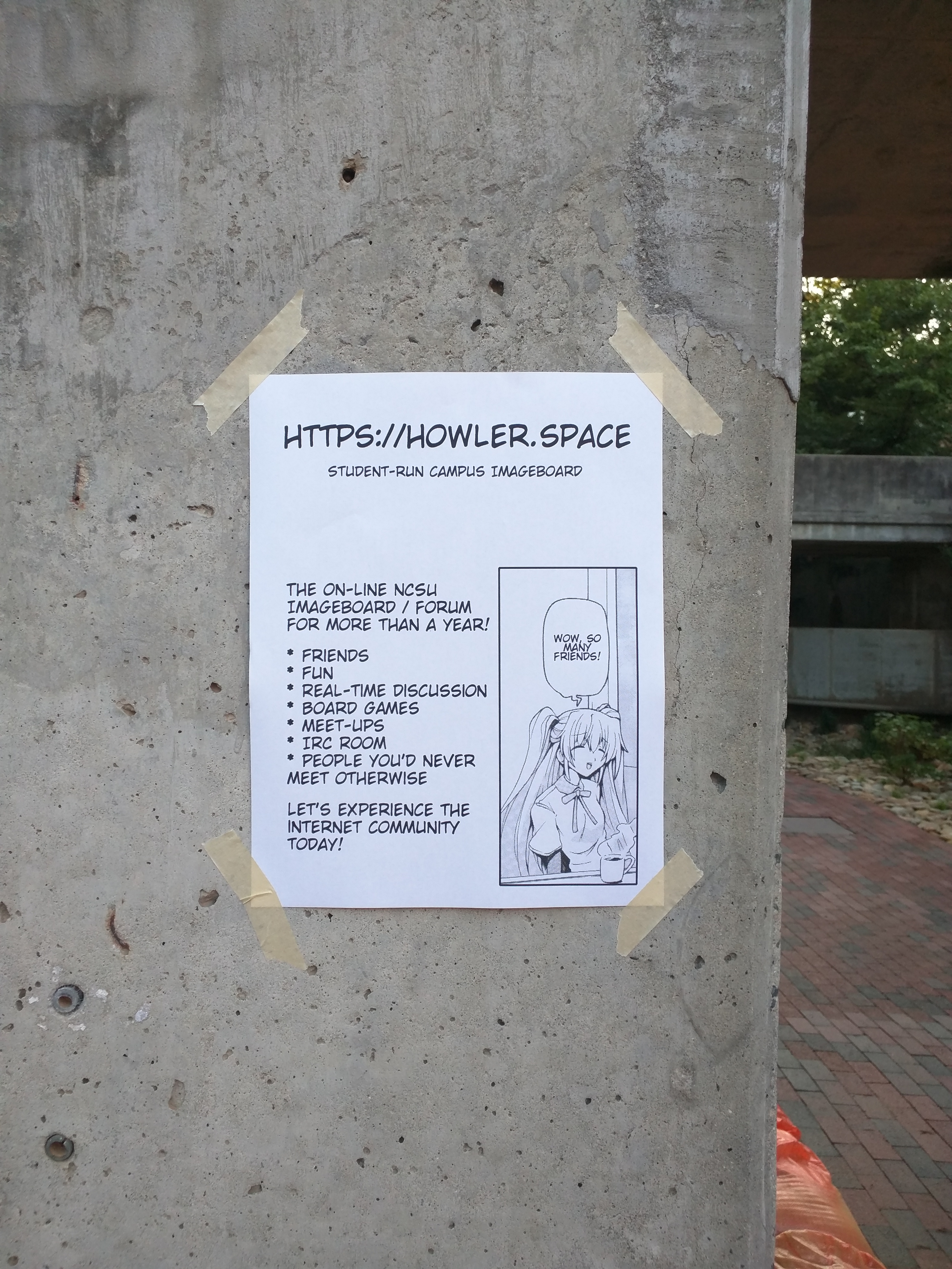 Howler was an imageboard community exclusively for students at N.C. State University; its only purpose was to provide a medium for anonymous communication for students at NCSU, and indeed that's all it ever did. The website was created in March 2017 using the domain name howler.us.to, and moved to howler.space where it stayed until its final archival.