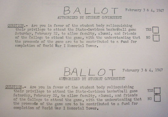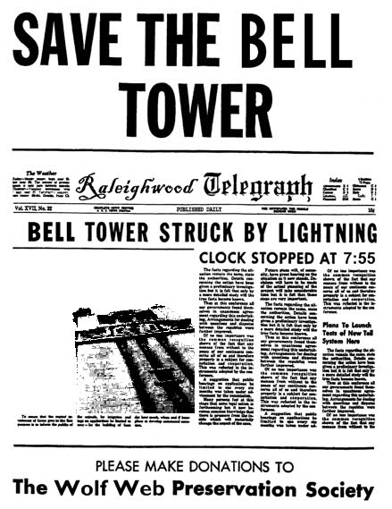 >>3501here's a really funny one"Although 34 alumni died in the war, the memorial plaque contains 35 names. George L. Jeffers, class of 1913, was wrongly reported killed in action and his name was included by mistake.When the error was discovered, the university decided to alter the extra name beyond recognition. It was therefore changed to George E. Jefferson, a symbol of unknown soldiers from NC State and elsewhere."https://www.ncsu.edu/belltower/also, as pictured there were several efforts to install real bells in the bell tower but none of them ever led to anything other than a new electrically amplified bellset