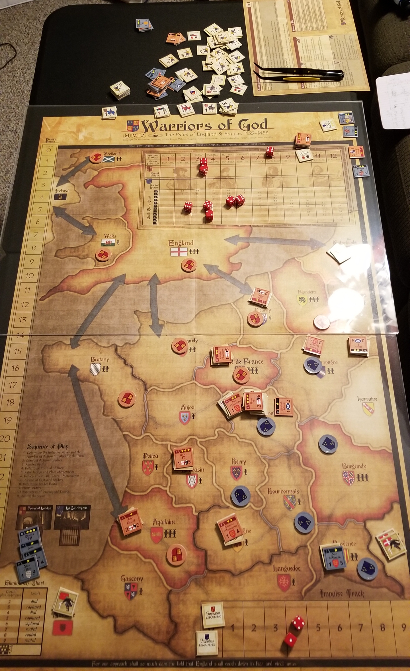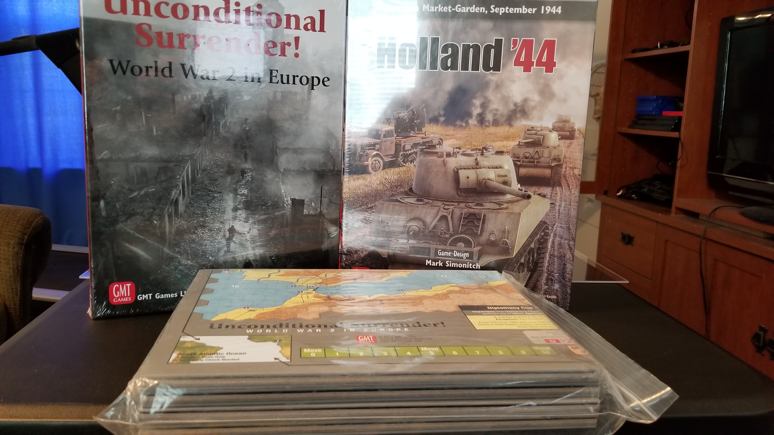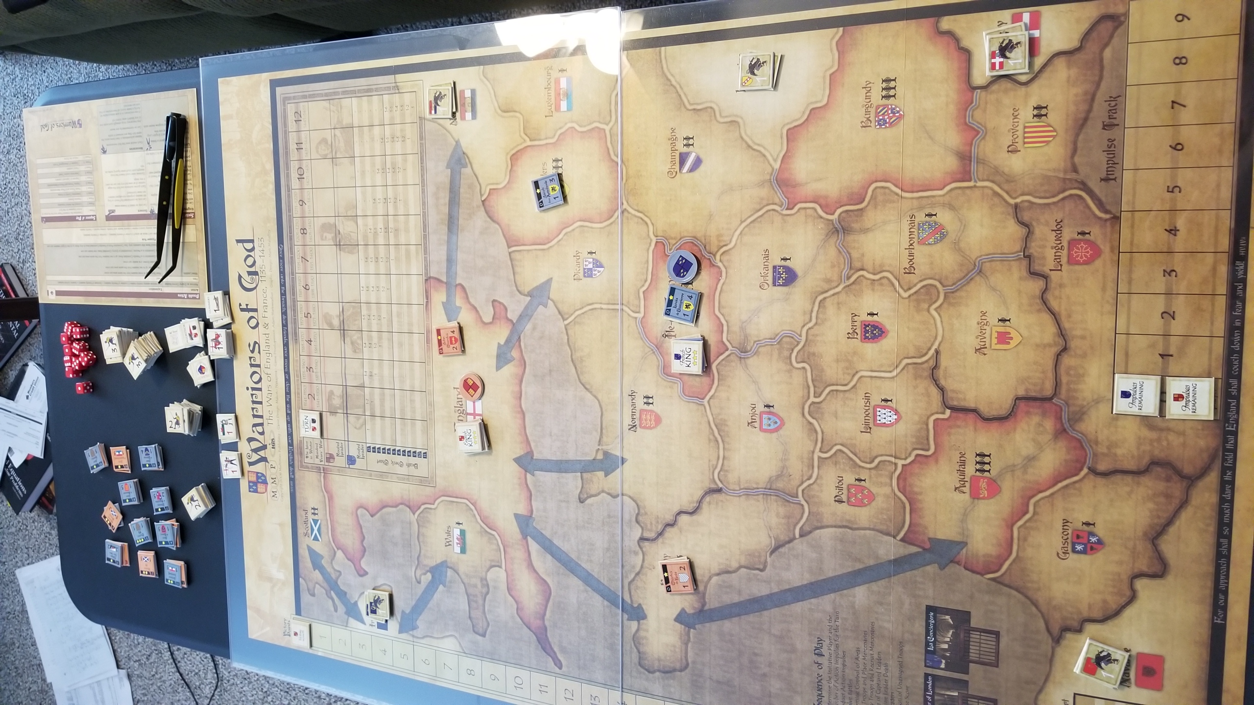Conductor we have a problemI knew that Unconditional Surrender was too large for my current setup - just one half of the map takes up 80% of my table - but I didn't realize Holland was too. The main Holland map fits fine, but I neglected to notice it has a map section you must append to the top, making it too large. Curse my small tableInstead I will play Warriors of God by MMP, a game about the 100 Years War