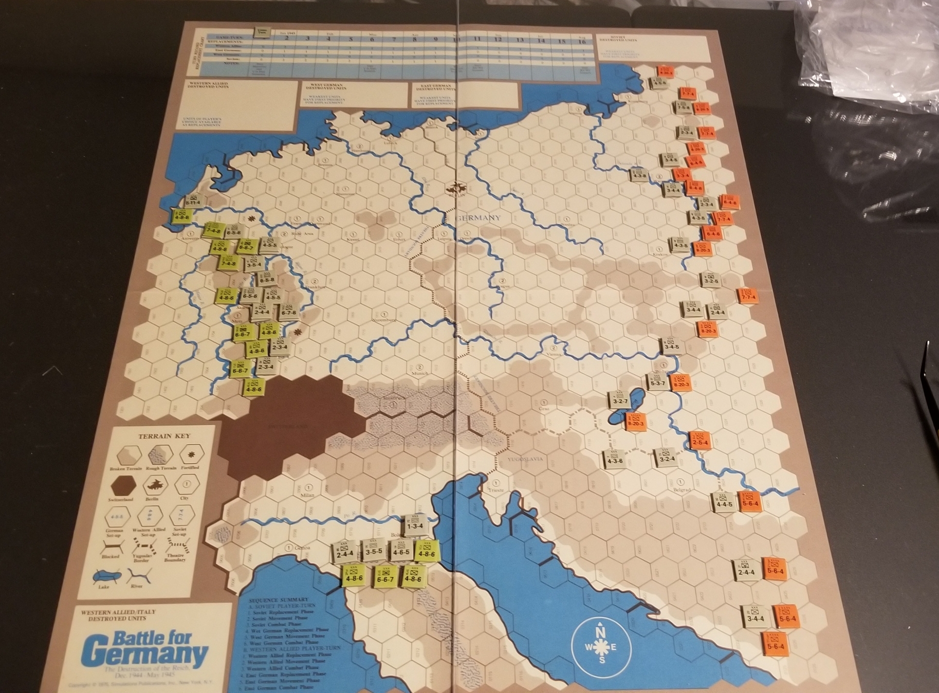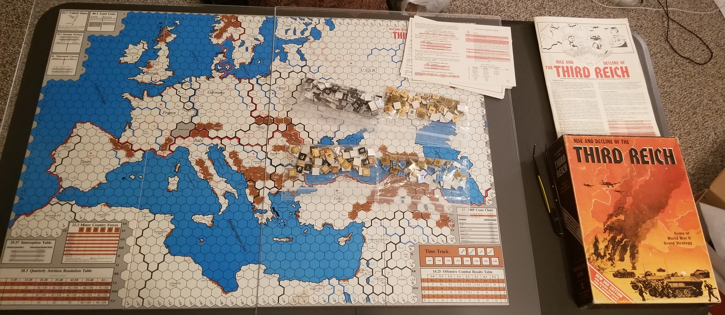 Next up on my table is Rise and Decline of the Third Reich, 3rd edition550 counters, 6 scenario cards, and a deluxe sized map. Unfortunately, I don't own Advanced 3R, which adds a lot of depth to the gameBack of the box says 4-12 hours, BGG says 24 hours.*actually just realized I have the 4th edition, the latest edition before they reimplemented it as A3R. The 4th edition still has 3rd edition on the box, but the rules says 4th edition.