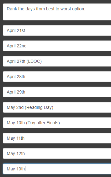 Quick note - something came up on the 28th, but I don't have to attend, it would just be nice tothe 29th was ranked just below the 28th, is there anyone who would have come if the meetup was on the 28th but can't if it gets moved to the 29th?